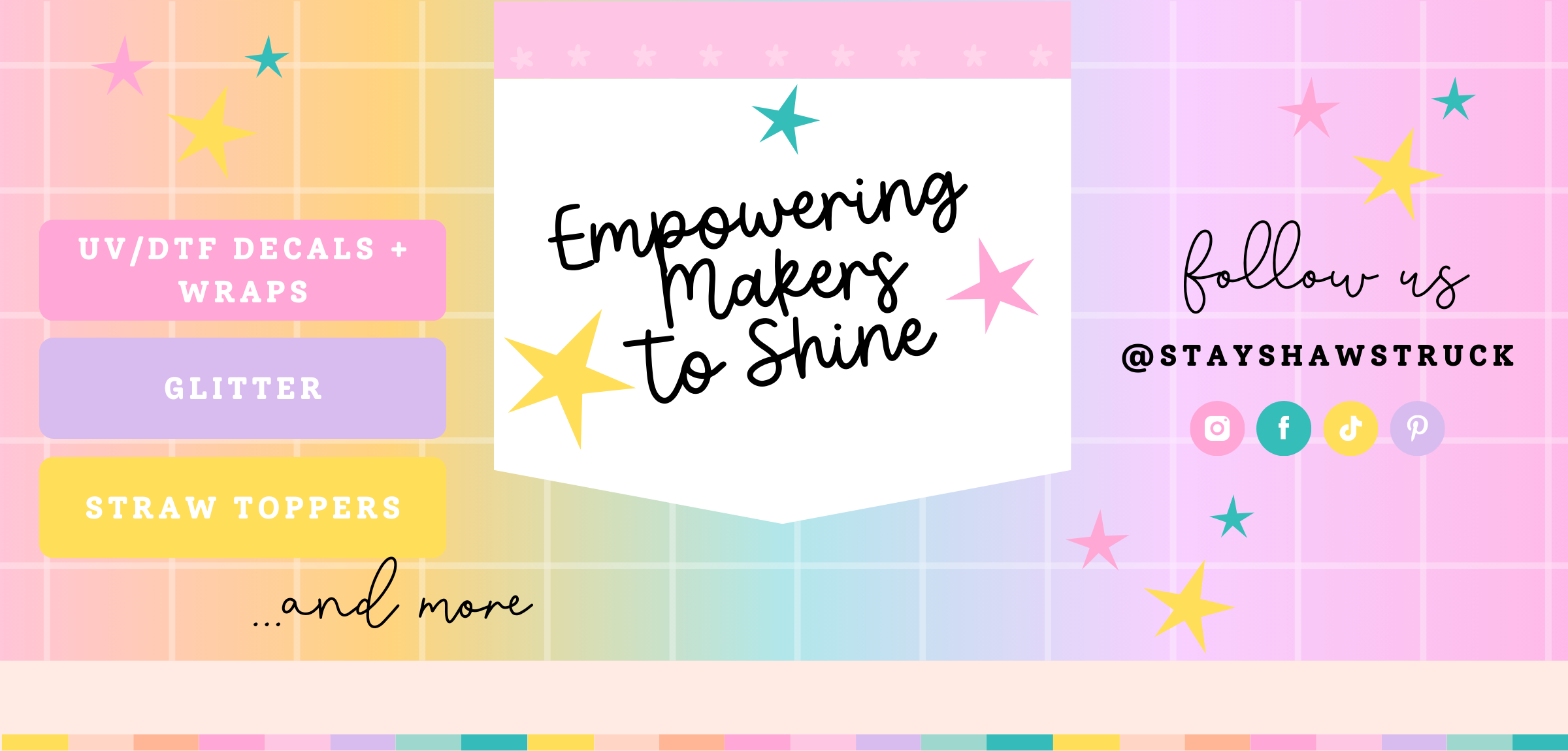 Signing up for one of our monthly Shawstruck Creation Studio subscription boxes is like gifting yourself a little creative joy every single month ✨ Choose from our Glitter Subscription or our 16 oz UV/DTF Wrap Subscription, and get ready for a beautifully curated surprise delivered straight to your door. Each box is a mystery—but you can trust that everything inside is made up of our same top-quality, maker-tested products, thoughtfully selected to match the seasons, trends, and creative inspiration throughout the year. Not only do subscribers enjoy the excitement of opening something new each month, but you’ll also save 15% off the regular retail price compared to purchasing items individually. Best of all, your box ships automatically, so there’s no reordering or decision fatigue—just a happy surprise waiting in your mailbox, month after month. It’s the perfect way to discover new favorites, stay inspired, and treat yourself to a little creative magic while building your maker stash with confidence. 💖✨